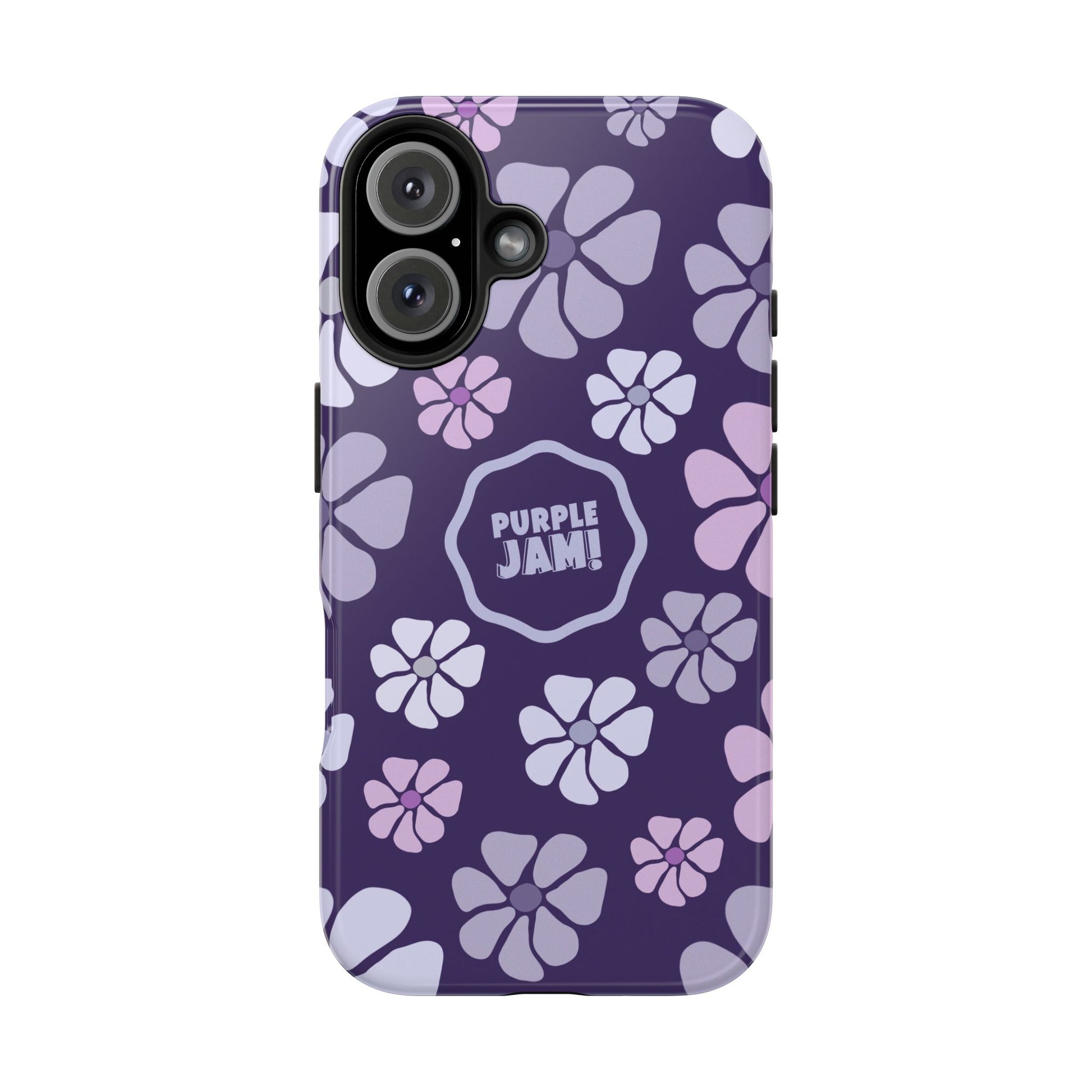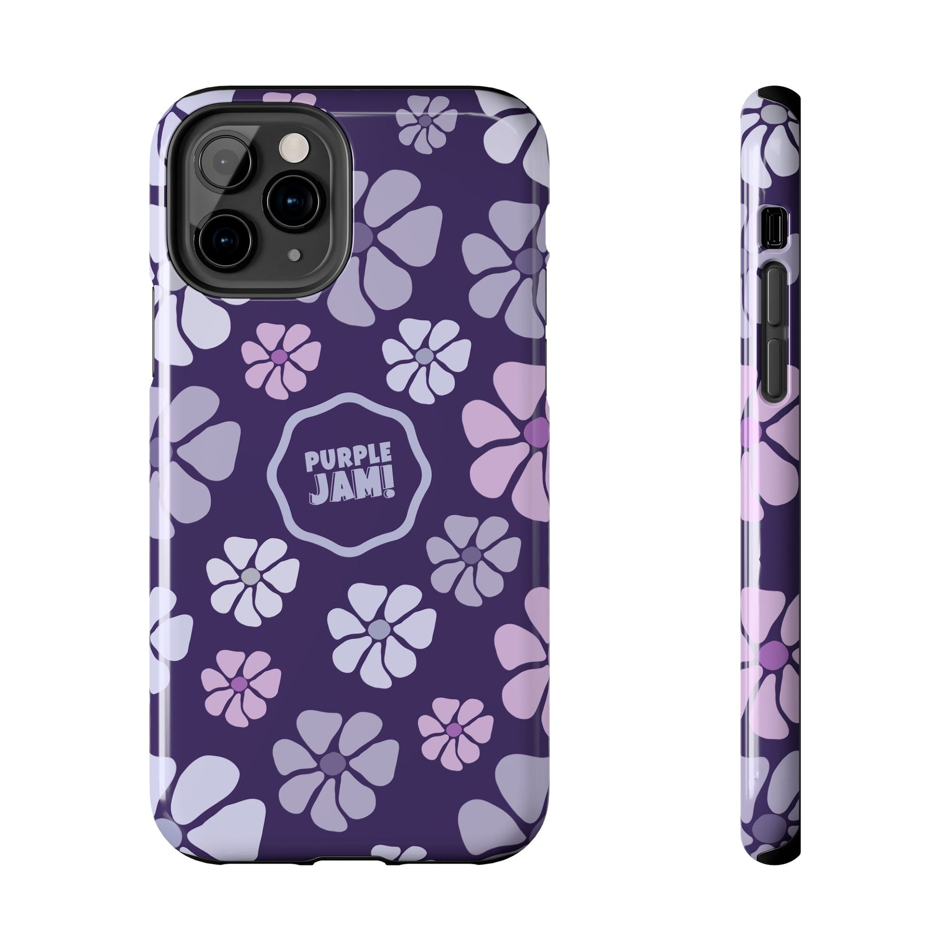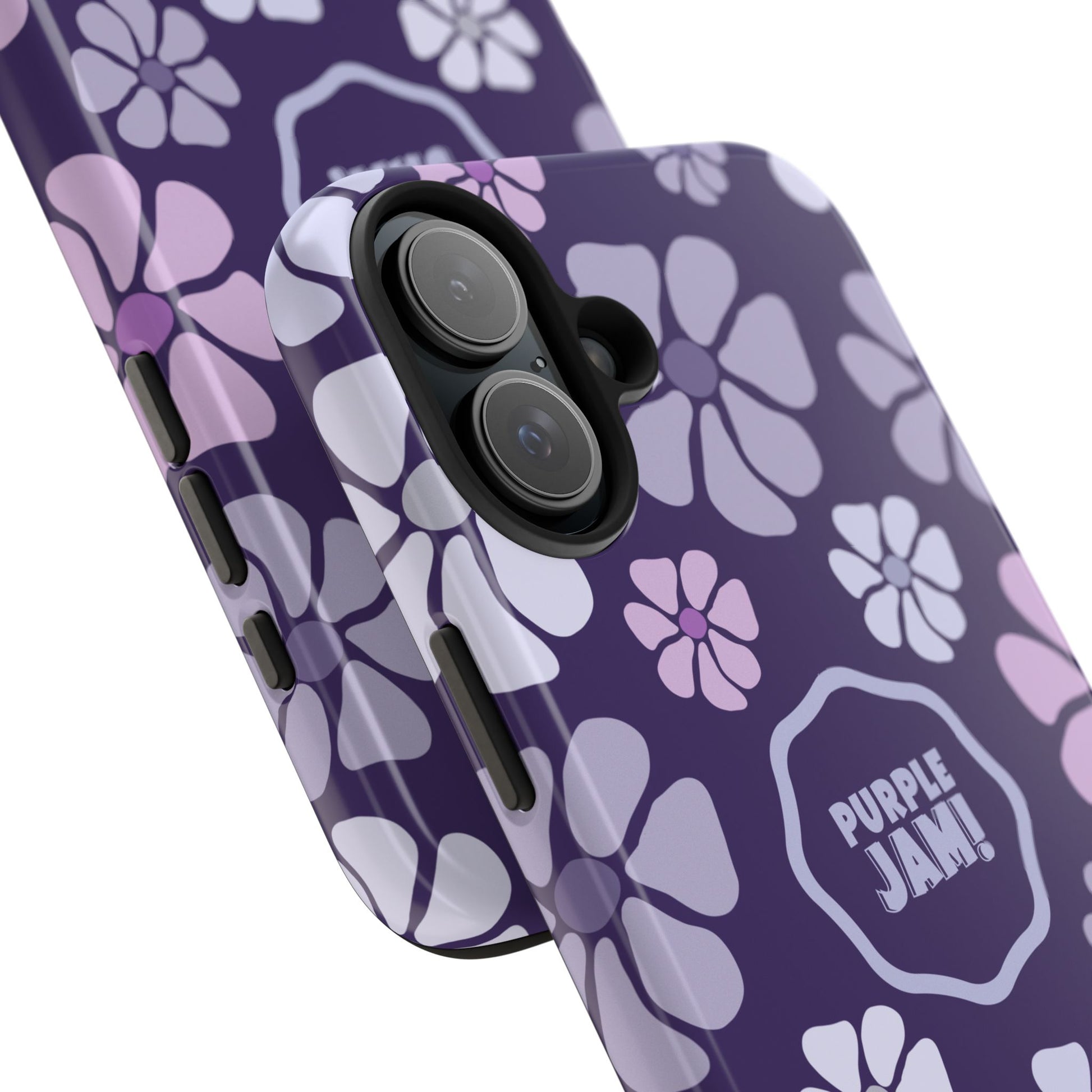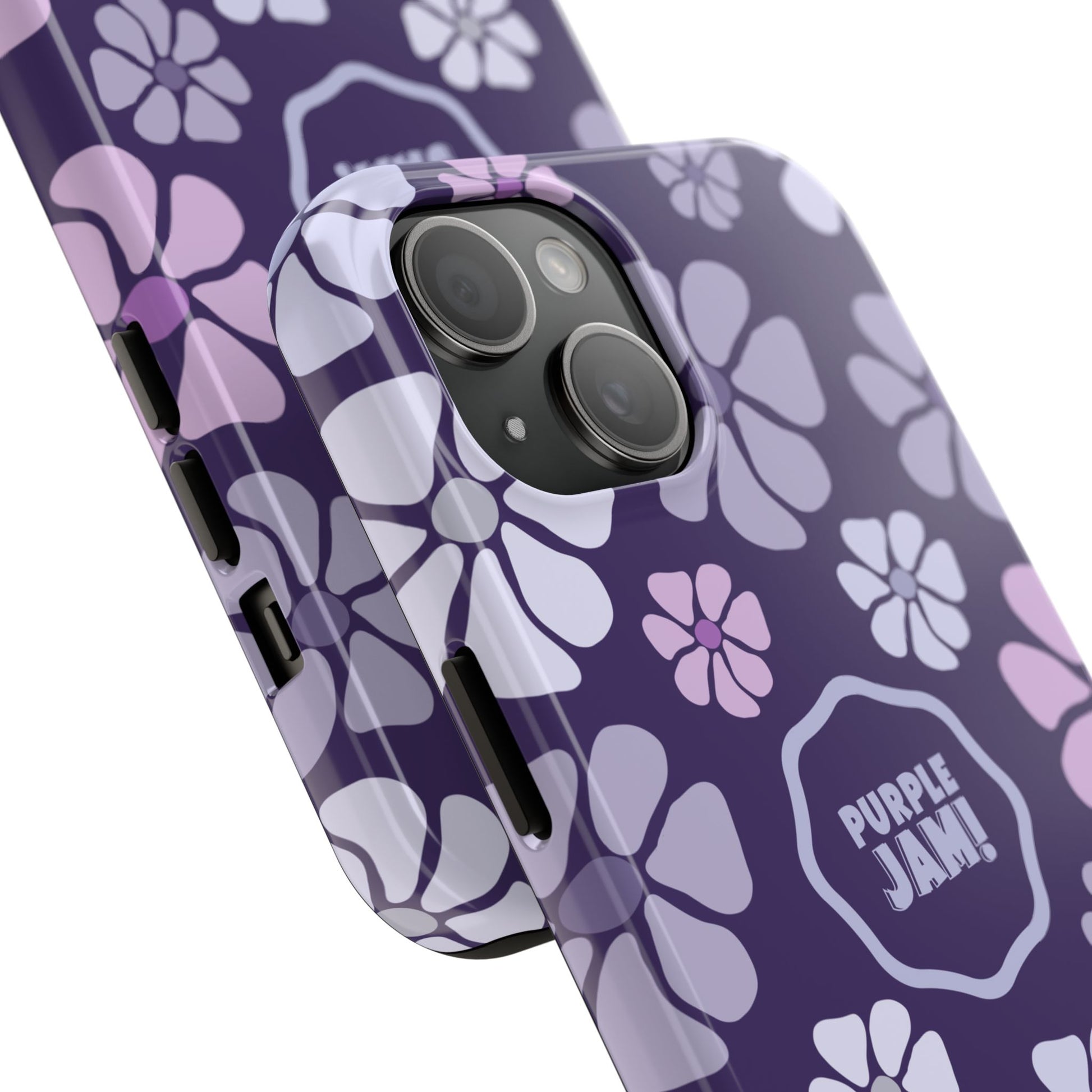 This slim, protective phone case wraps your device in a cheerful pattern of soft lavender and lilac blossoms against a deep purple backdrop. The glossy finish makes colors pop and the centered “PURPLE JAM!” badge adds personality without shouting. It feels light in the hand but built to absorb everyday knocks, with a rubber inner liner that cushions impacts and a raised bezel to keep your screen off rough surfaces. Bring a little playful, retro-inspired color to your daily carry — something that looks good on a night out, during a coffee run, or tucked into a tote on market day.