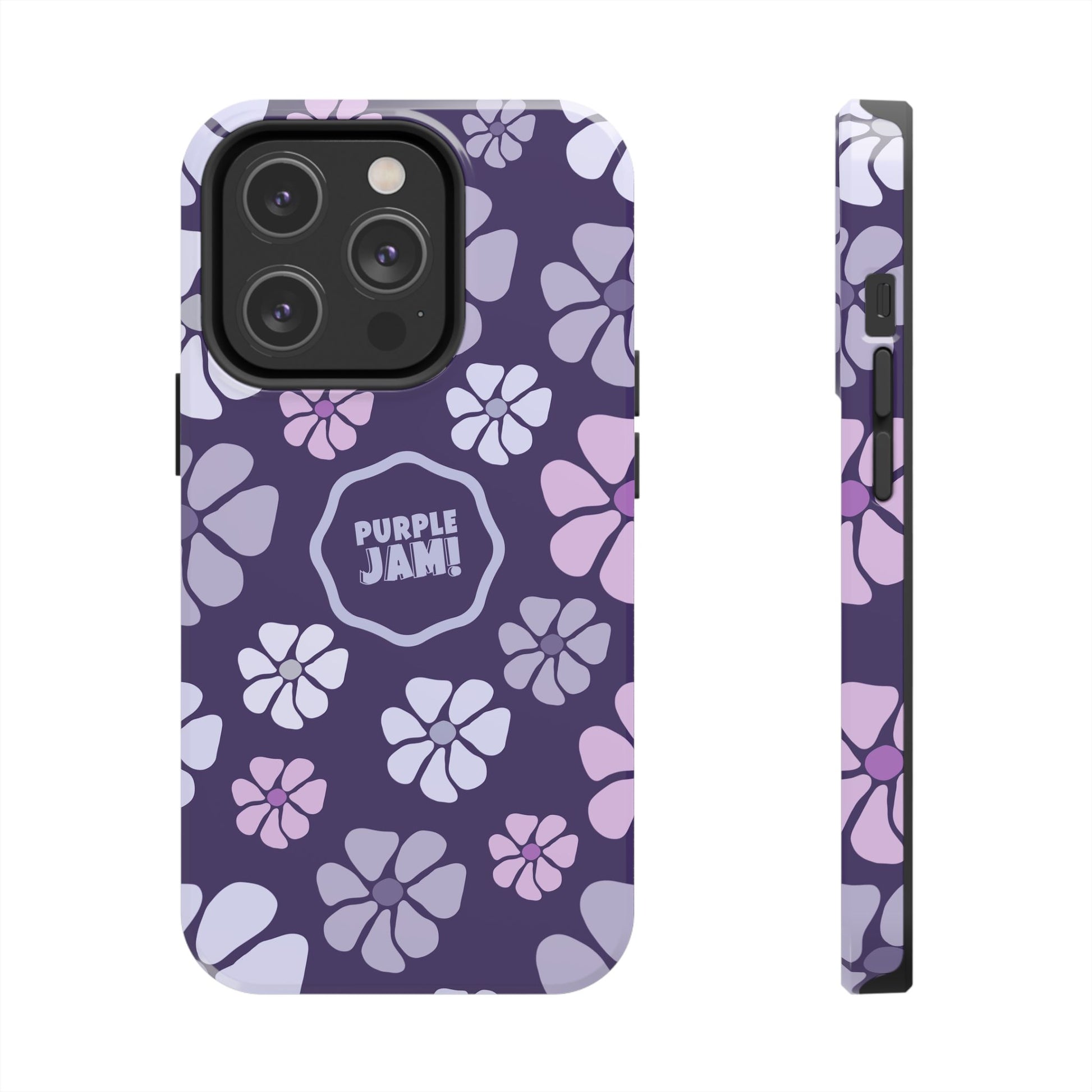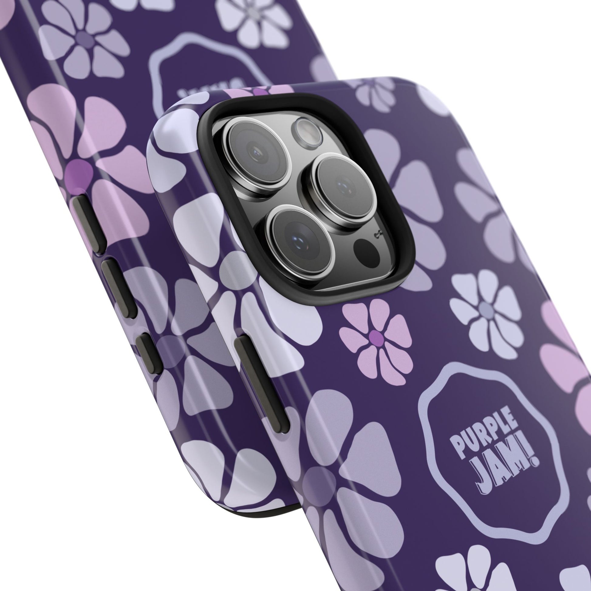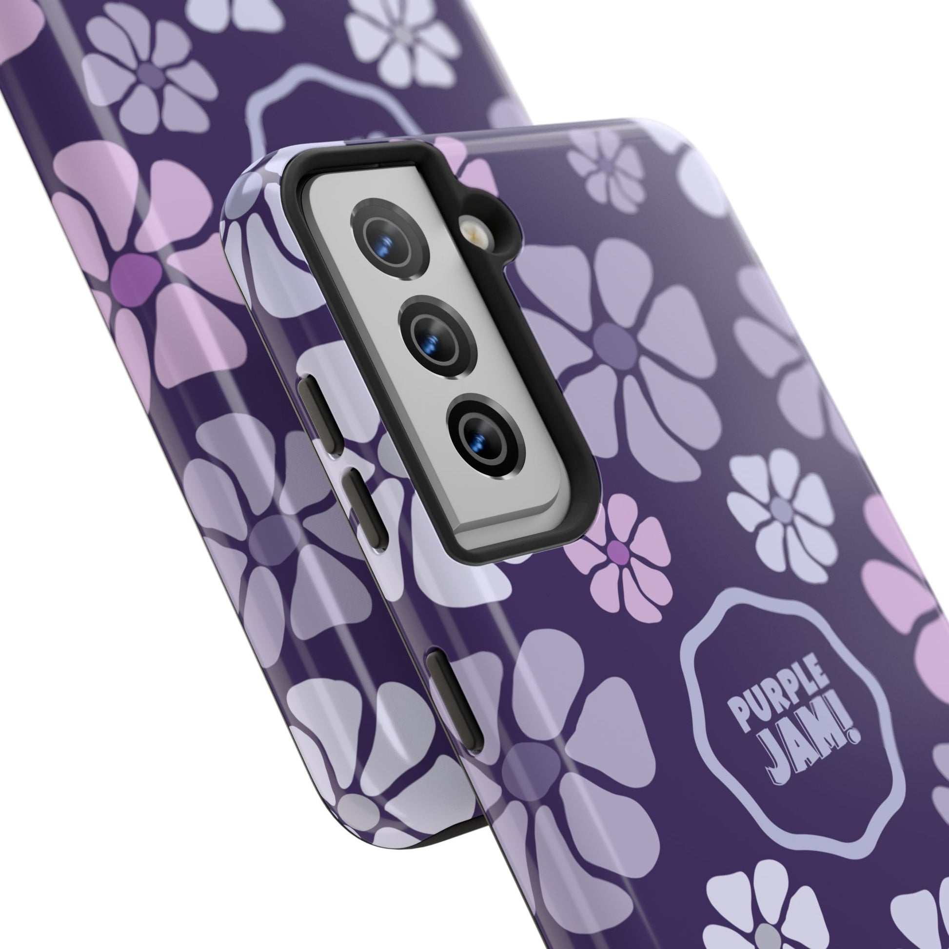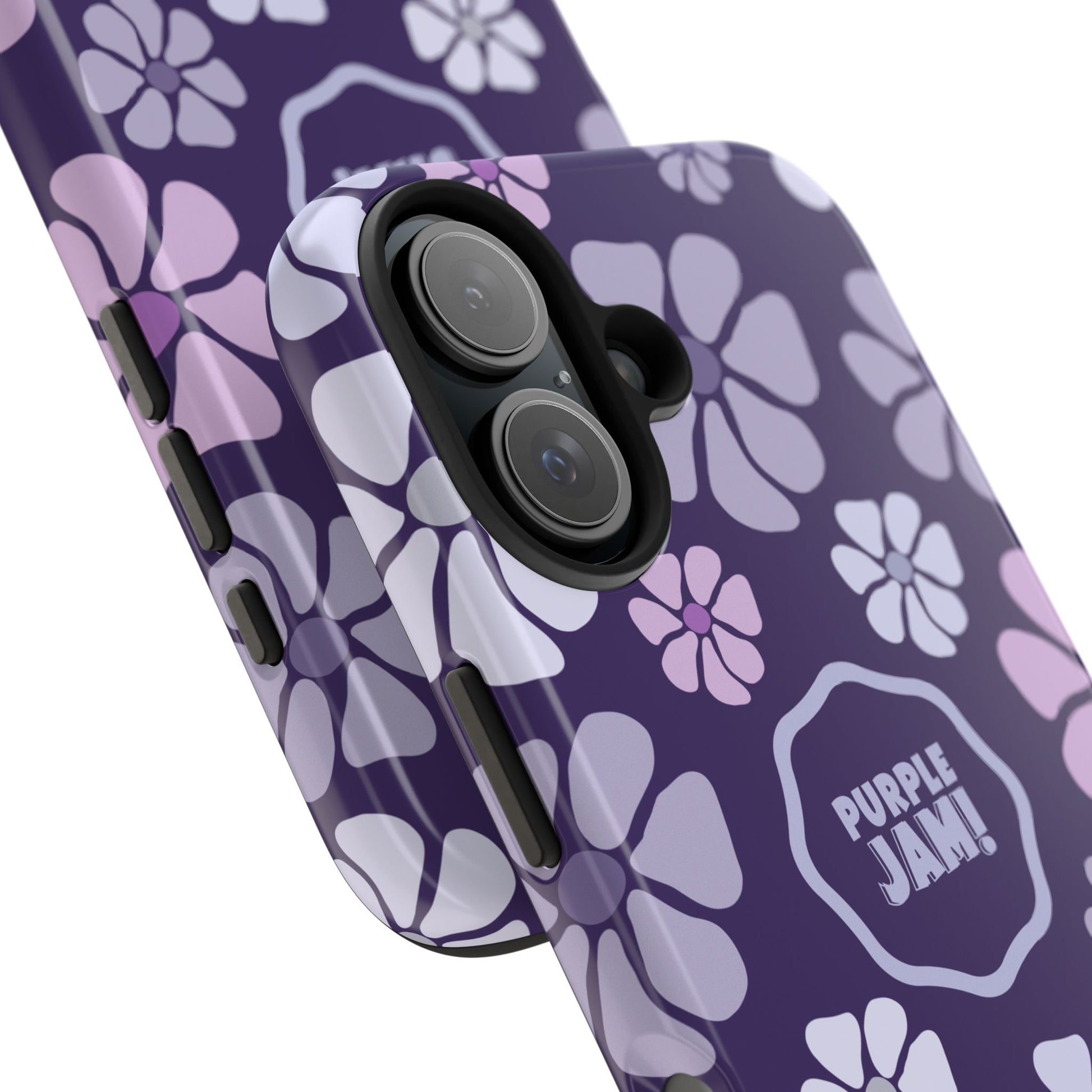This slim, protective phone case wraps your device in a cheerful pattern of soft lavender and lilac blossoms against a deep purple backdrop. The glossy finish makes colors pop and the centered “PURPLE JAM!” badge adds personality without shouting. It feels light in the hand but built to absorb everyday knocks, with a rubber inner liner that cushions impacts and a raised bezel to keep your screen off rough surfaces. Bring a little playful, retro-inspired color to your daily carry — something that looks good on a night out, during a coffee run, or tucked into a tote on market day.